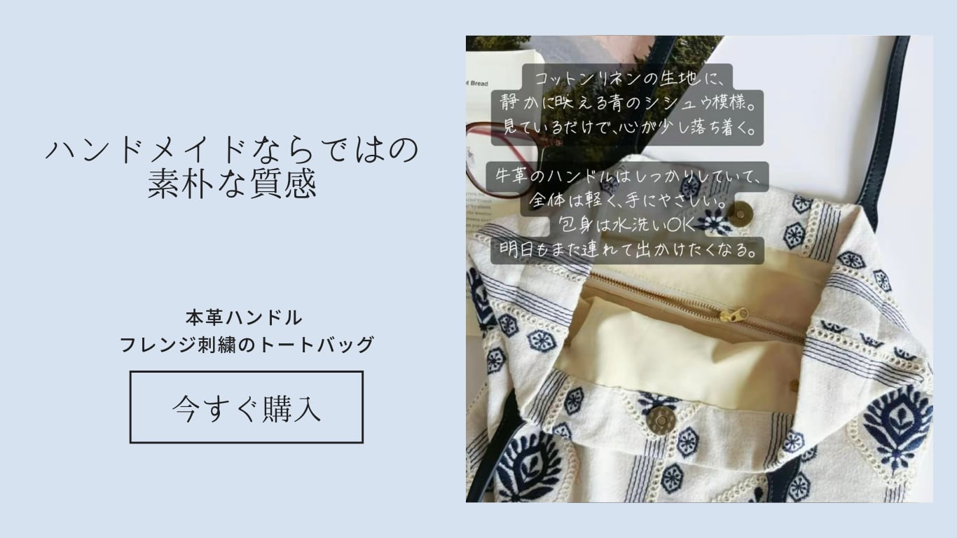 【本革ハンドル】フリンジ刺繍のトートバッグ ネイビーモチーフ × コットンリネン A4入れサイズ 布バッグ
