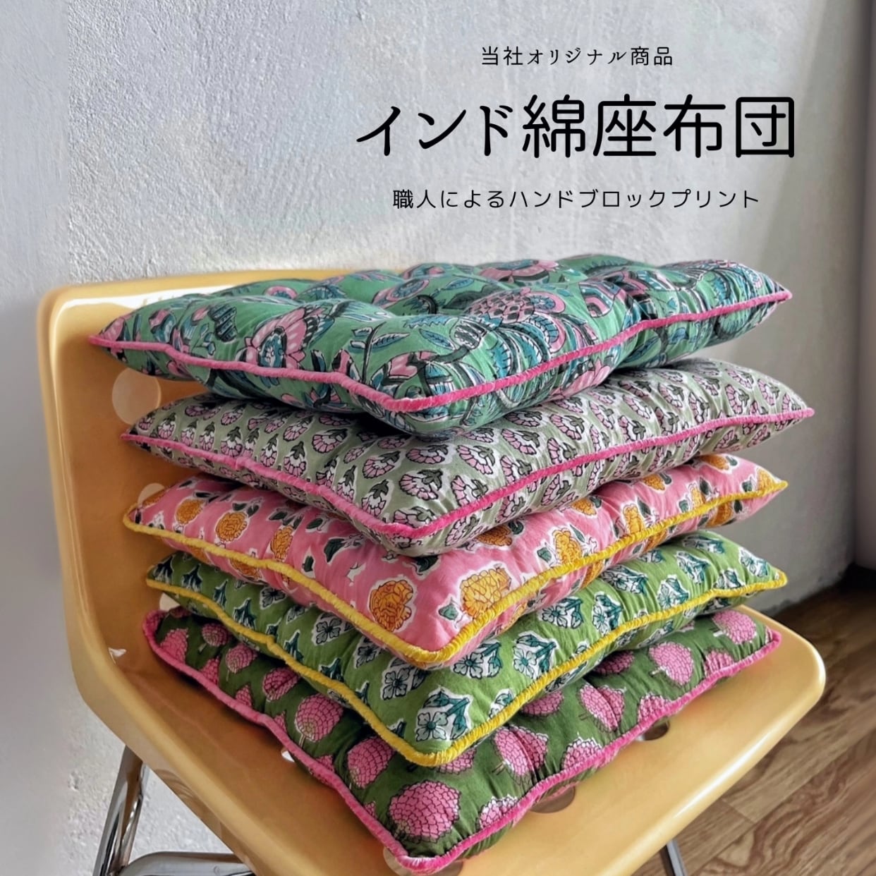 {予約販売}【洗えるインド綿カラフル座布団】ハンドブロックプリント|厚み約5cm|35×35cm コンパクト