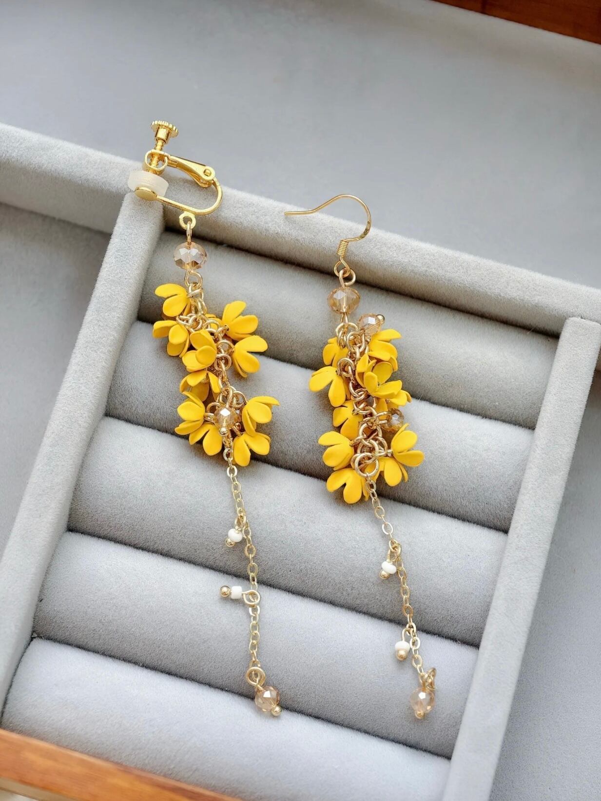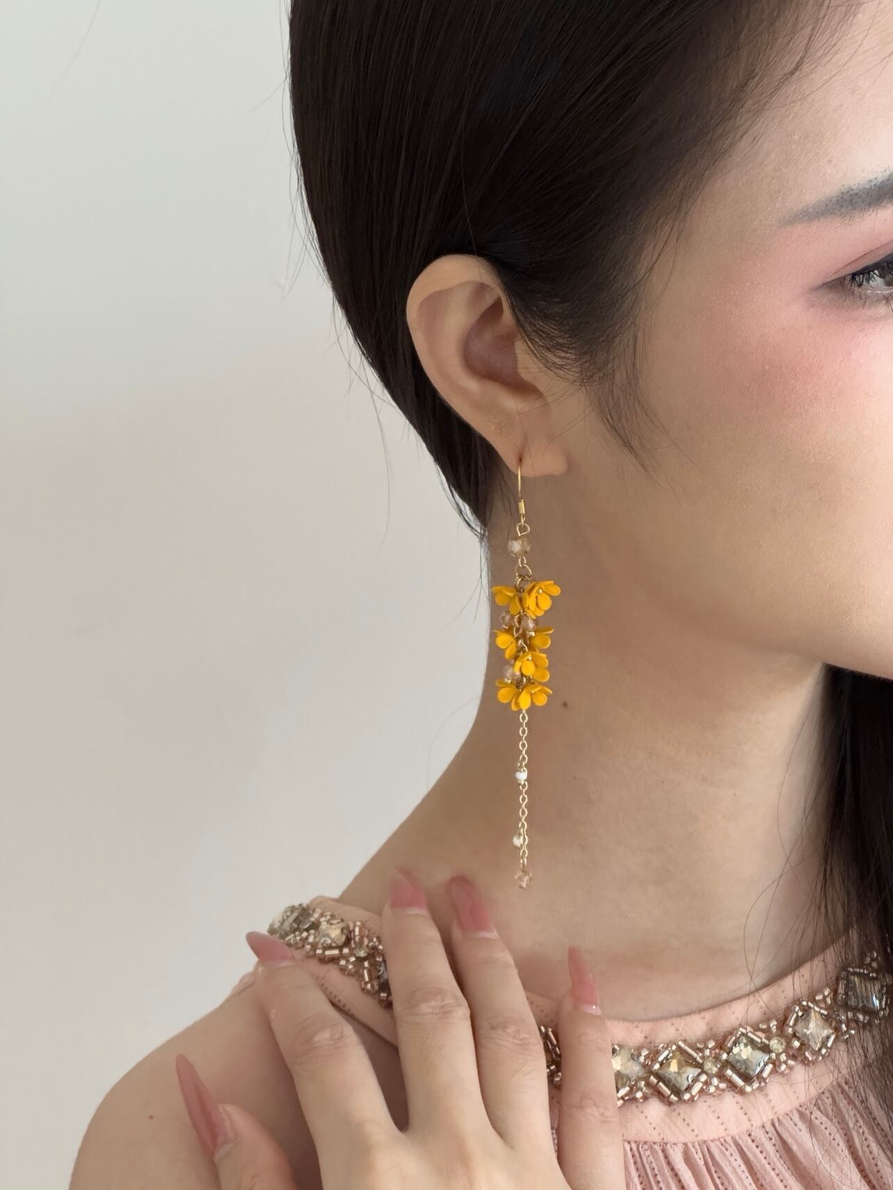 ハンドメイドならではの温かみと上品さを大切に仕上げています。オレンジイエローの小花が耳元でそっと咲き、揺れるビーズがきれいめな輝きをプラス。