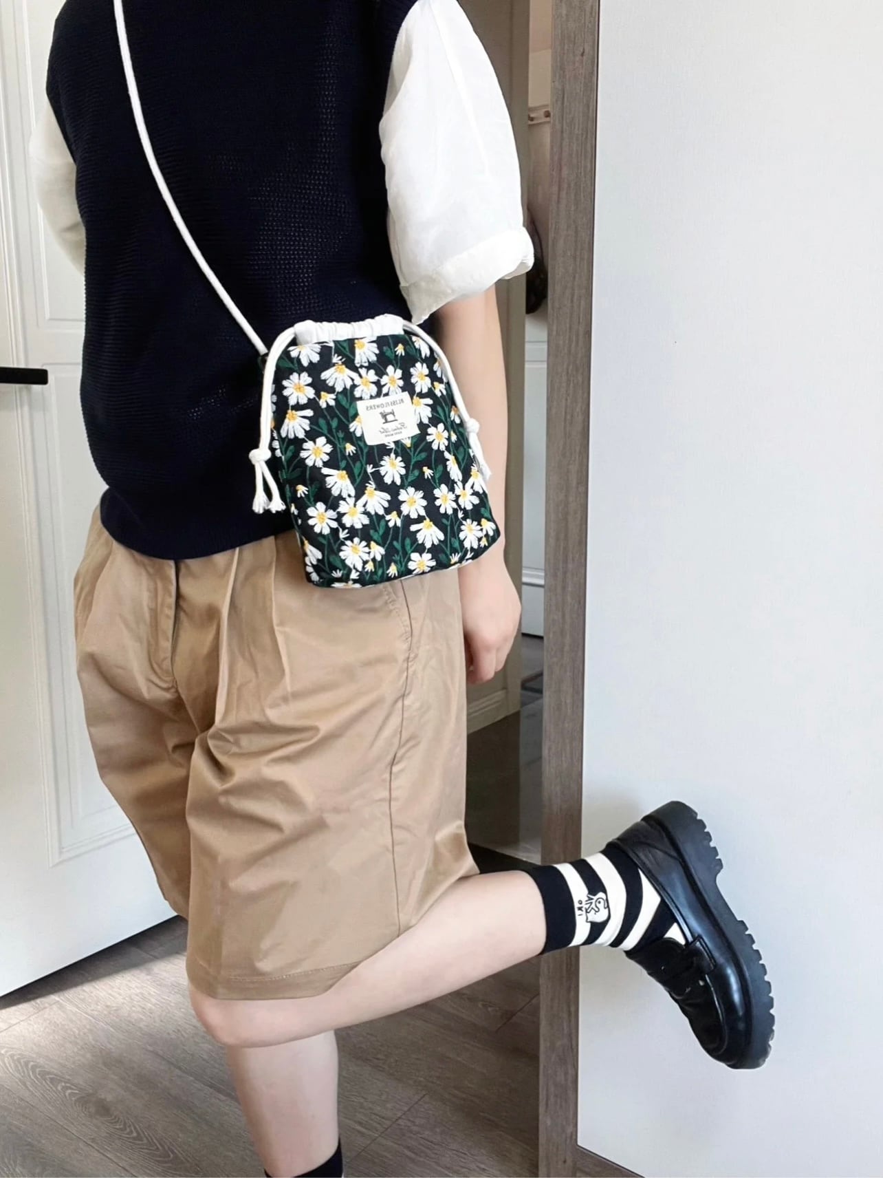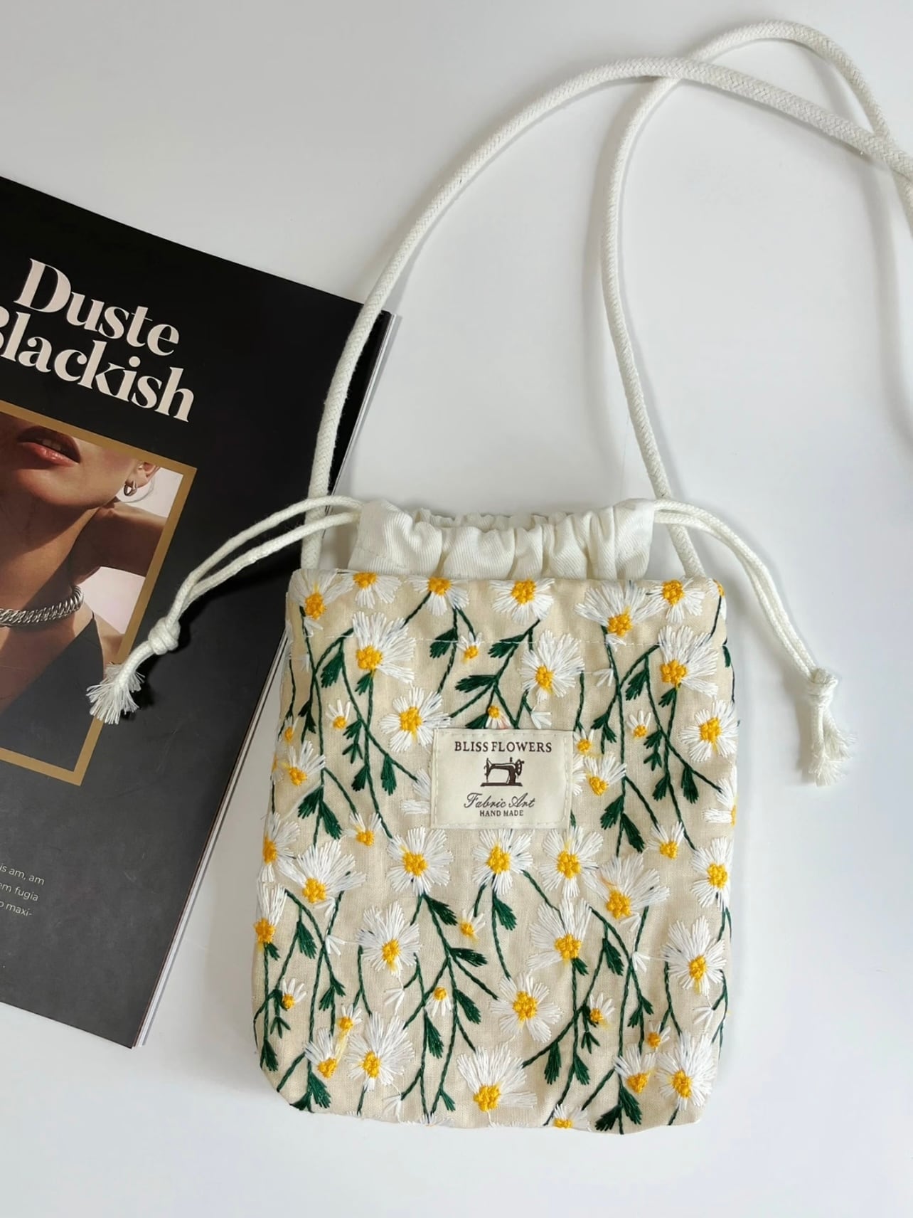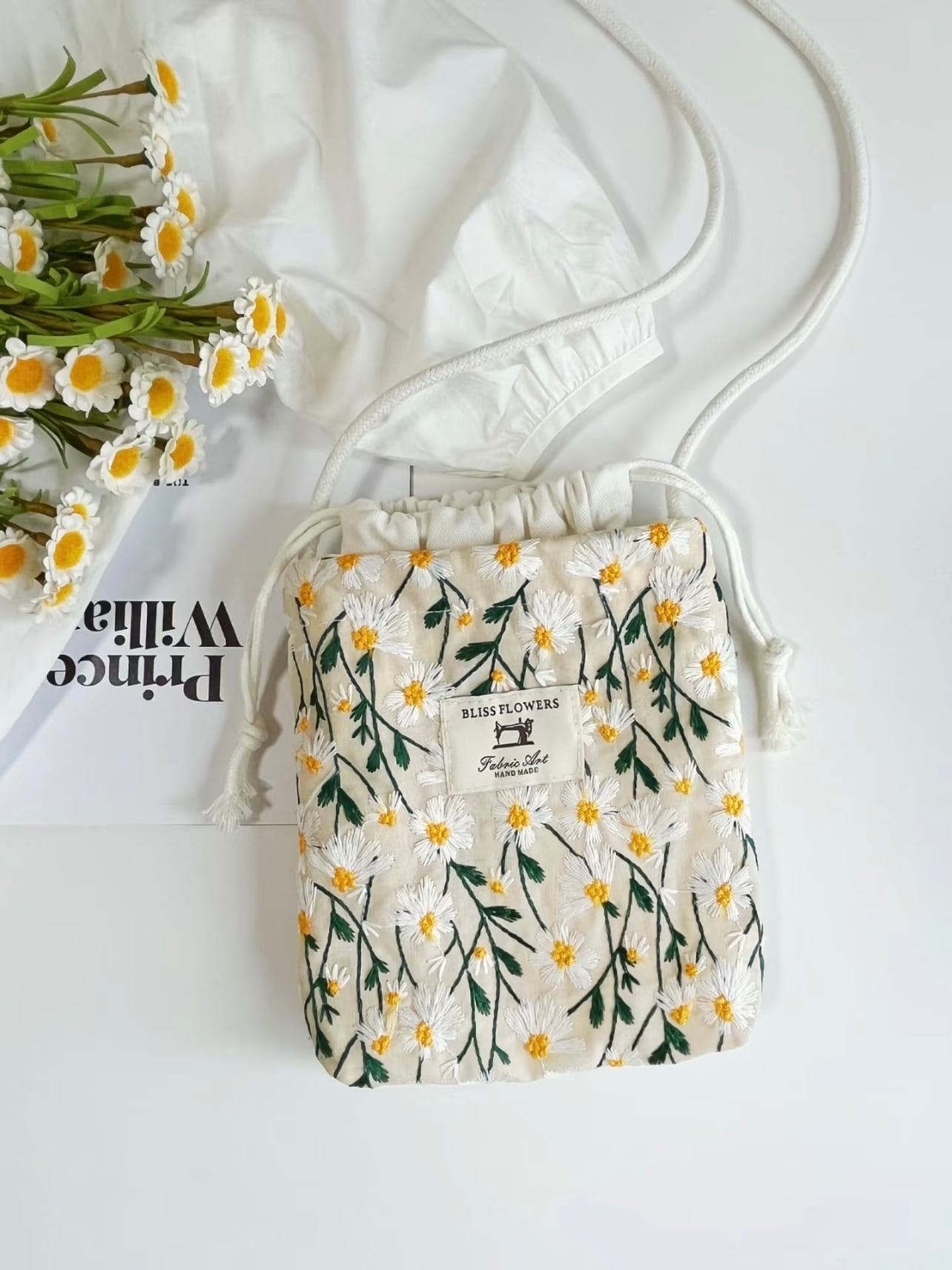 {予約販売}【デイジー刺繍の巾着スマホショルダー】コットンリネン生地・ナチュラル布バッグ 2色展開 サコッシュ 斜め掛け