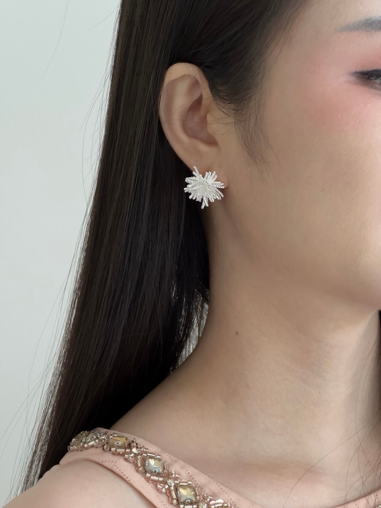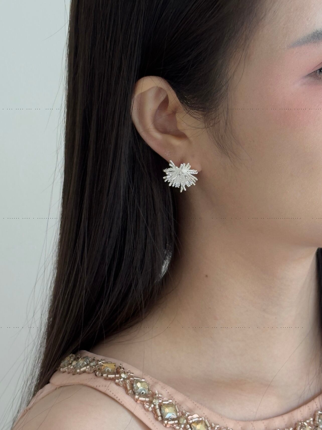 繊細な立体フォルムが光を受けて反射し、角度によって表情を変えます。夏の夜の花火のようでもあり、冬の雪の結晶のようでもある――静かで美しい輝きを感じさせるアクセサリーです。